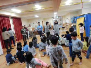 2.1 鬼がやってきた!!! たいこの音がどんどんと聞こえてくると・・・・どののクラスからも鳴き声が響き渡っていましたよ。 今日の午後からは遊びの達人「あそびやさん」が来てくれました。 ホールでふじ組のお友だちと色々な遊びをたのしみました。