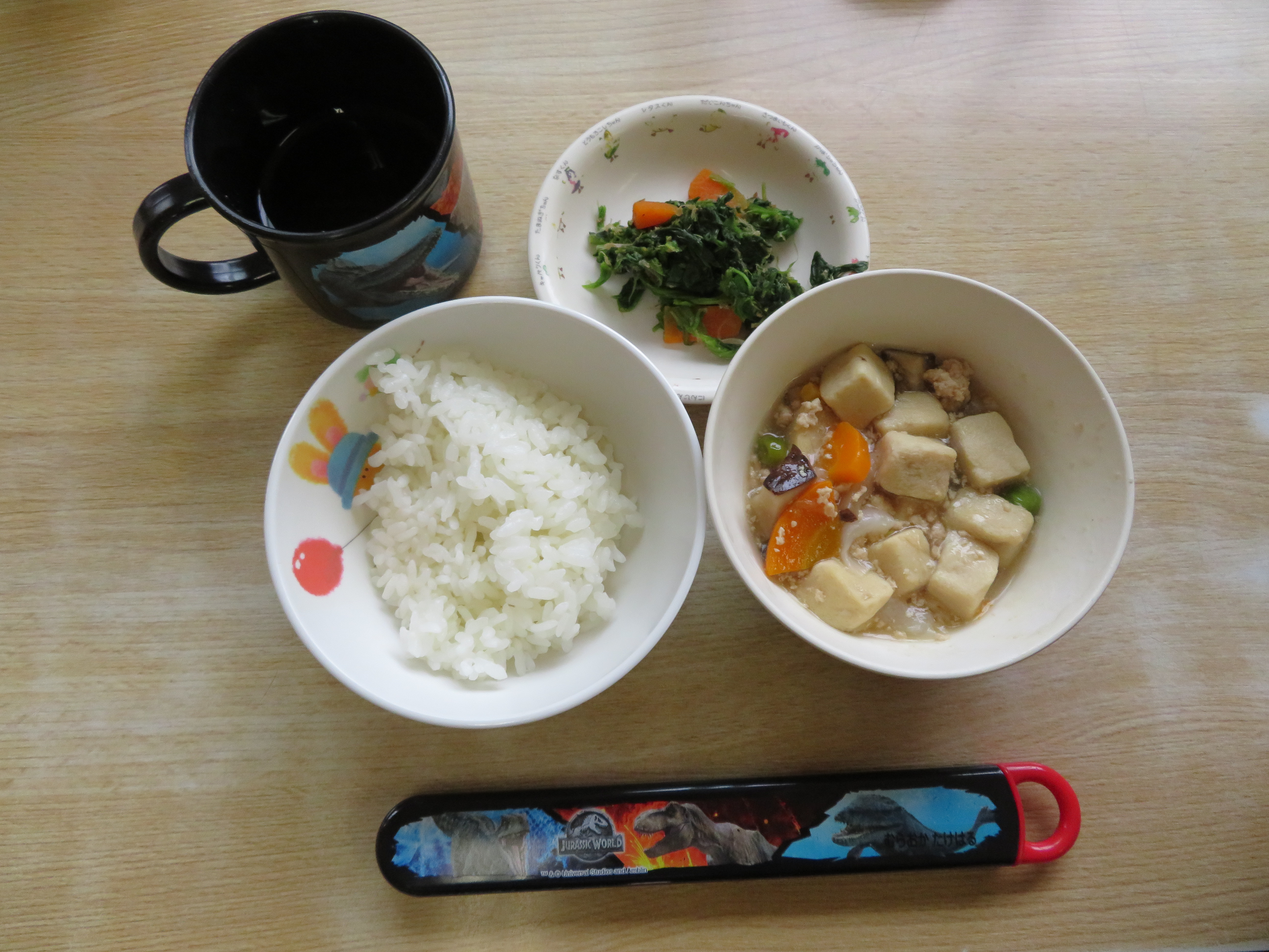 6月24日(月)7倍粥・豆腐のそぼろ煮・コロコロサラダ 高野豆腐のそぼろ煮・ほうれん草のお浸し