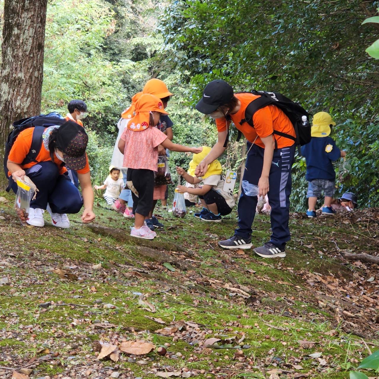 すみれ組のお友だちは冒険の森に続く坂道付近でどんぐり拾いを満喫さました。